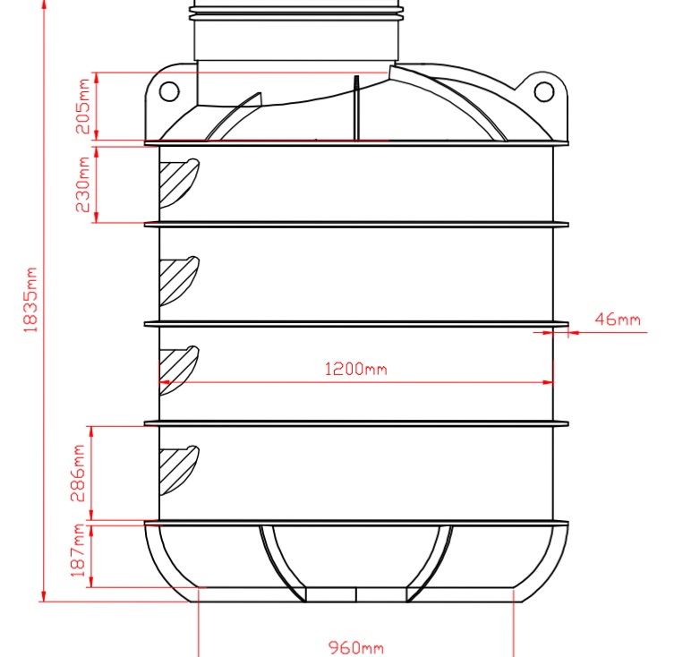 - Studnia włazowa 1200/1800 z zagęszczonego polietylenu (PEHD), z wzmocnioną podstawą oraz ożebrowaniem utrzymującym zbiornik w gruncie.