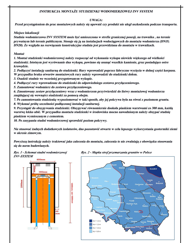 Zestaw zawiera pokrywę PP A15, korek styropianowy, korpus studni, otulinę z poliuretanu, belkę do montażu konsoli wodomierzowej, deklarację zgodności, atest PZH oraz instrukcję montażu.